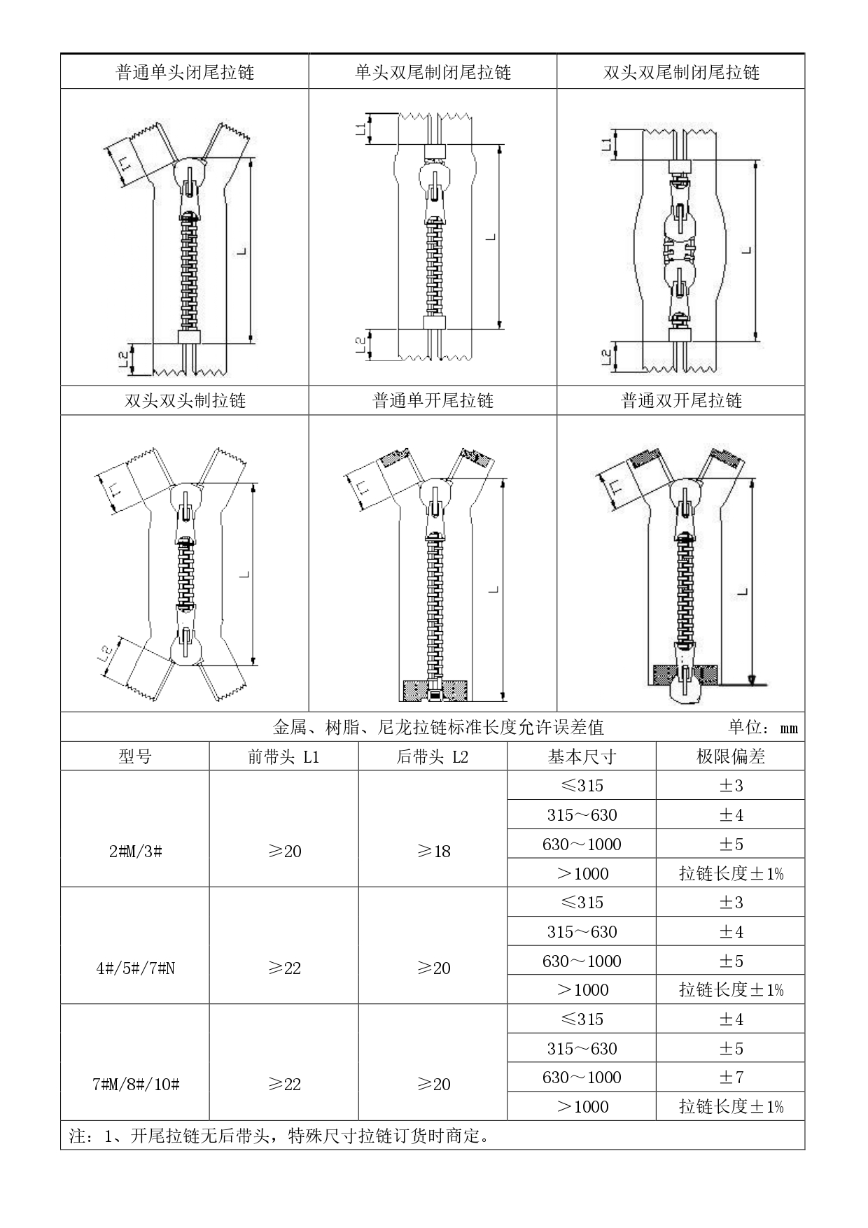 1.1、拉鏈按型式分為條裝拉鏈和碼裝鏈帶:條狀拉鏈可分為開尾拉鏈和閉尾拉鏈;開尾拉鏈又分為單開尾拉鏈和雙開尾拉鏈;閉尾拉鏈可分為單頭閉尾拉鏈和雙頭閉尾拉鏈;雙頭閉尾拉鏈可分為: