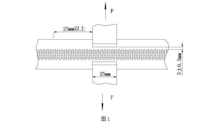 8.2.2、測試步驟取長度大于 75mm 的拉鏈樣本一段,裝夾在上述夾具中,裝夾時應將鏈牙腳和夾具的夾口部位對齊緊靠(如圖 1)。啟動材料試驗機,測試至脫牙或者布帶破損為止,此時顯示的最大數值即為碼裝的平拉強力值,采取多次測試取有效范圍值。