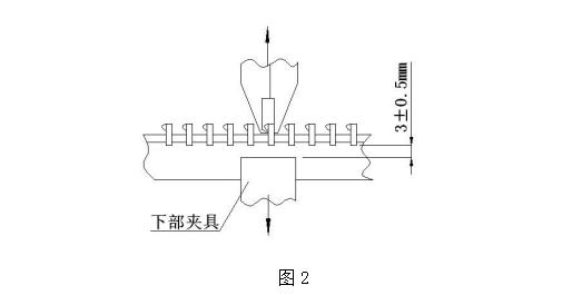 9.2.2、測試步驟 取長度大于 50mm 的拉鏈單邊鏈帶樣本一段,裝夾在上述夾具中,裝夾時(shí)應(yīng)將鏈牙腳和夾具的夾口部位對齊緊靠(如圖 2)。用單牙拉脫加緊鉗夾住一顆鏈牙,啟動測試儀,測試至脫牙為止,此時(shí)顯示的最大數(shù)值即為單牙結(jié)合強(qiáng)力值,采取多次測試取有效范圍值。