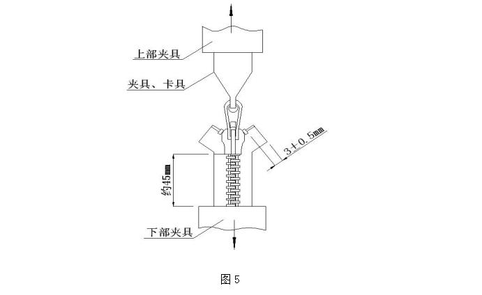 取長度大于 50mm 帶拉頭和上止的拉鏈樣本一段,將拉鏈的非上止端垂直裝夾在下夾具上,將拉片垂直掛在上夾具掛鉤上或者將拉頭拉片垂直裝夾在上夾具中(如圖 5)。啟動測試儀,測試至拉鏈破損或者拉頭拉脫為止,此時(shí)的強(qiáng)力即為上止強(qiáng)力,采用多次測量取有效范圍值。