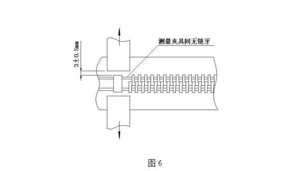 取長度大于 50mm 的閉尾拉鏈樣本一段,將下止以上的咪牙去除掉 3~4 粒后裝夾在上述夾具中, 裝夾時(shí)應(yīng)將下止對準(zhǔn)夾具的中間部位,下止和夾具的夾口部位對齊緊靠(如圖 6)。啟動測試儀,測試至下止變形松動、脫落或者布帶破損為止,此時(shí)顯示的最大數(shù)值即為碼裝的平拉強(qiáng)力值,采取多次測試取有效范圍值。