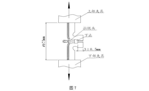 取長度約 50mm 帶拉頭(自鎖頭應(yīng)先排除自鎖功能)及下止的拉鏈樣本一段,將拉頭拉至下止(拉片翻起),兩帶筋分別裝夾于上下夾具間(先去掉一段約 10mm 的鏈牙),夾具距離約 75mm(如圖 7)。啟動測試儀,測試至拉鏈破損為止,此時(shí)的強(qiáng)力值即為下止強(qiáng)力,采用多次測試取有效范圍值。