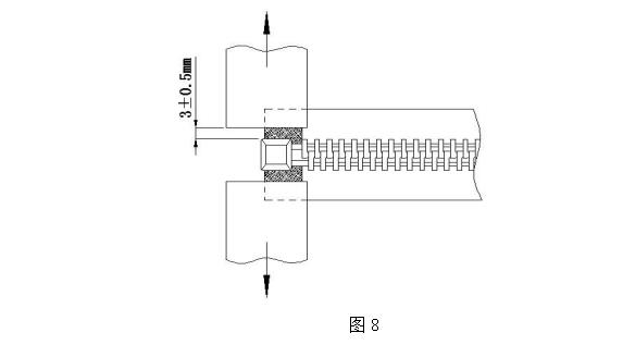 取長度大于 50mm 帶分開件的拉鏈樣本一段,將分開件處裝夾在上述夾具中。裝夾時(shí)夾具邊緣必須與插銷的內(nèi)側(cè)端(即靠近鏈牙一端)成一直線,夾口靠緊插銷插座(如圖 8)。啟動測試儀器,測試至分開件相互脫離或者布帶破損為止,此時(shí)的強(qiáng)力值即為拉鏈開尾平拉強(qiáng)力,采用多次測試取有效范圍值。